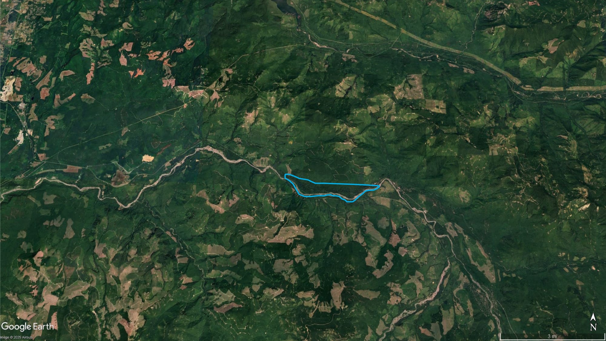 Highlighted in blue: Federation Forest State Park holds one of the last remnants of old growth in this satellite view.