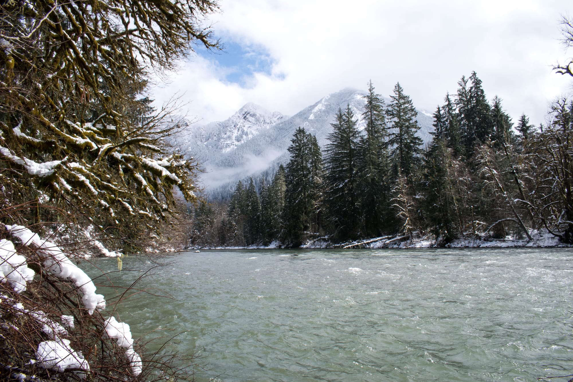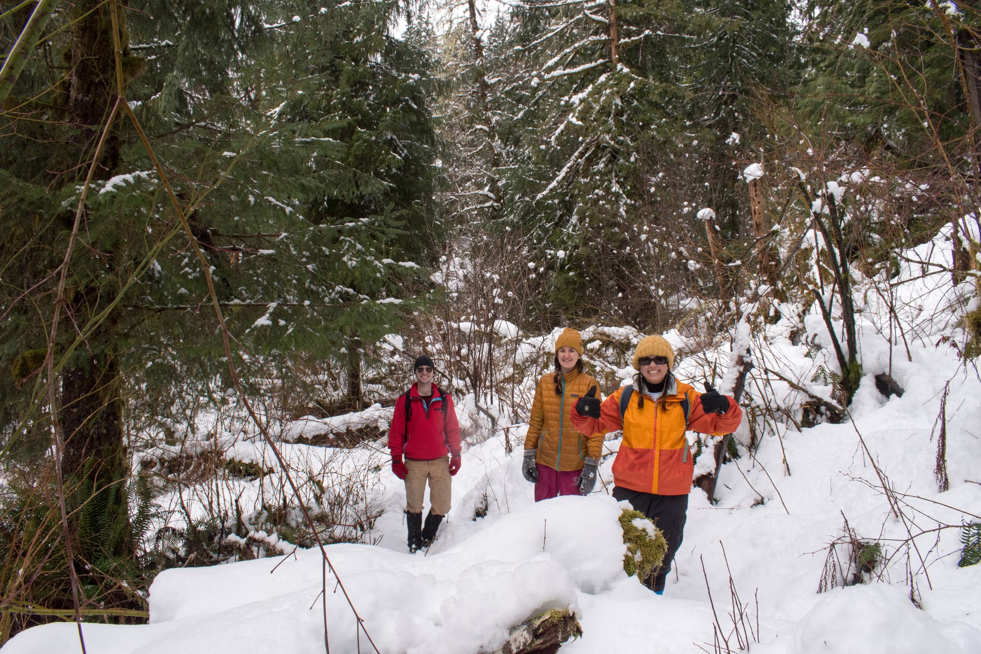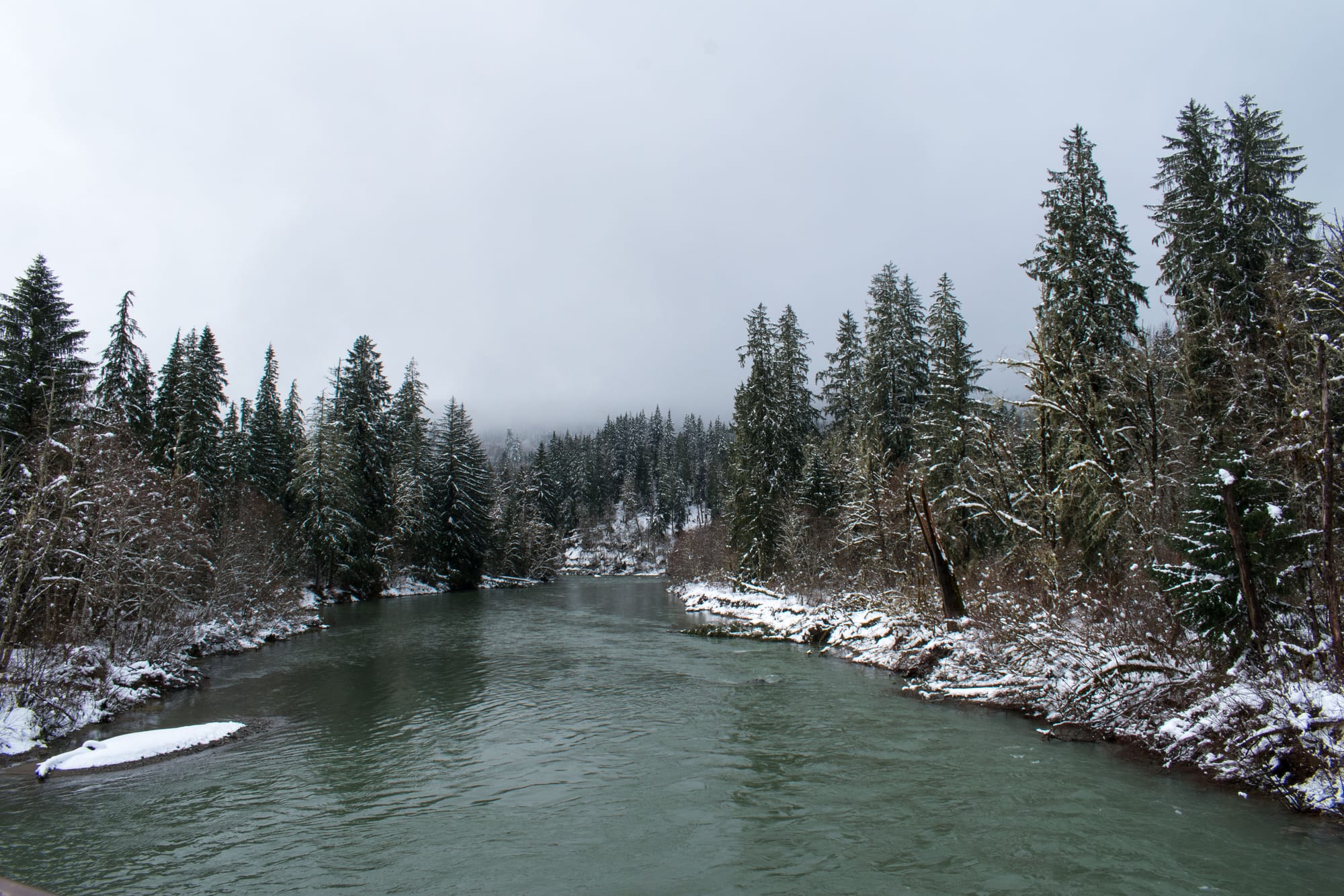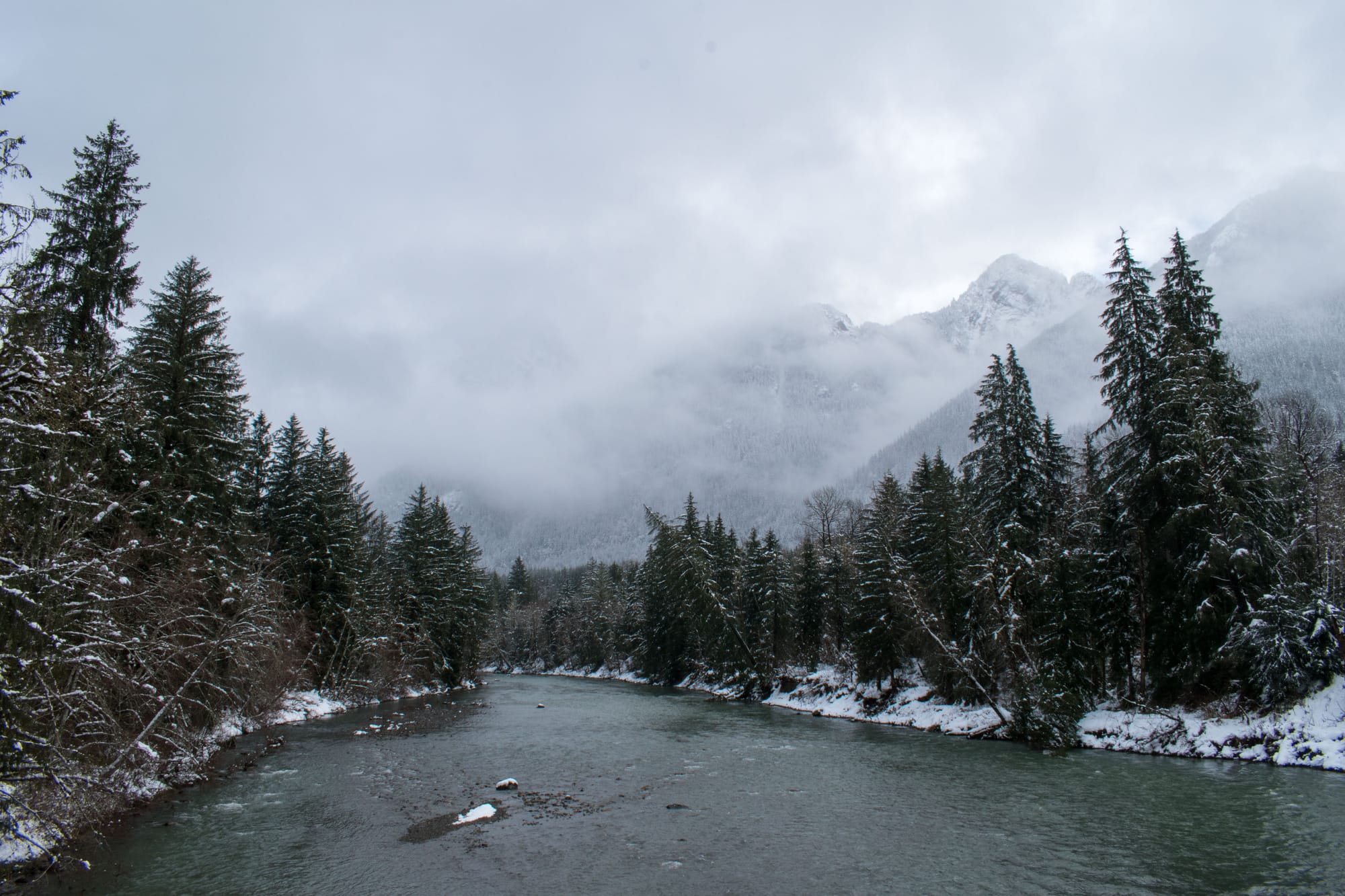 We opted to plow ahead with our weekend hike plan, but it became much more of a snowventure than anyone anticipated. We'd set out for an excursion similar to my previous up the Middle Fork Snoqualmie, but the snow got thick quick, and ditching the vehicle 5 miles from our destination sounded like a far more satisfying choice than digging ourselves out of a snow bank. Thankfully, there was a secret trail along the river not far from where we parked (made even more secret by almost a foot of snow).