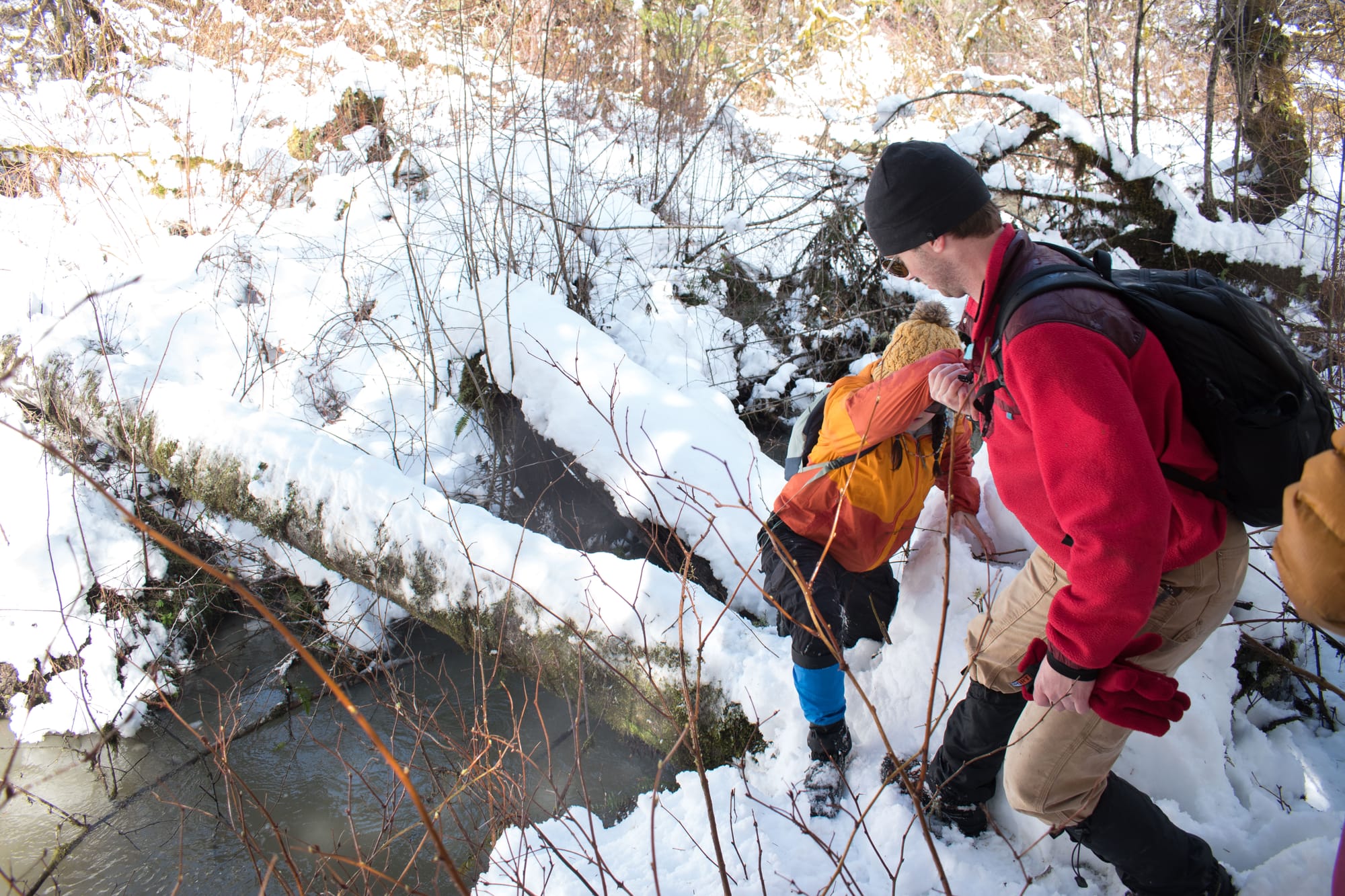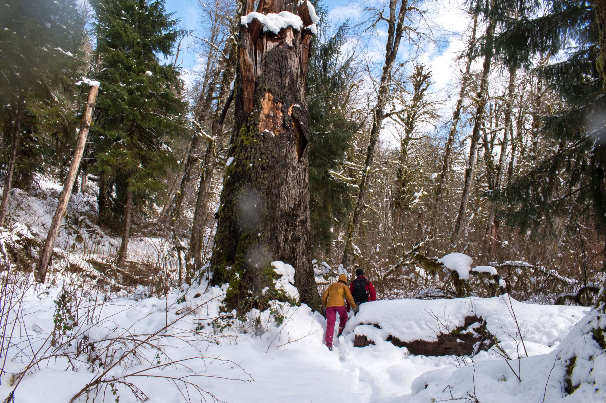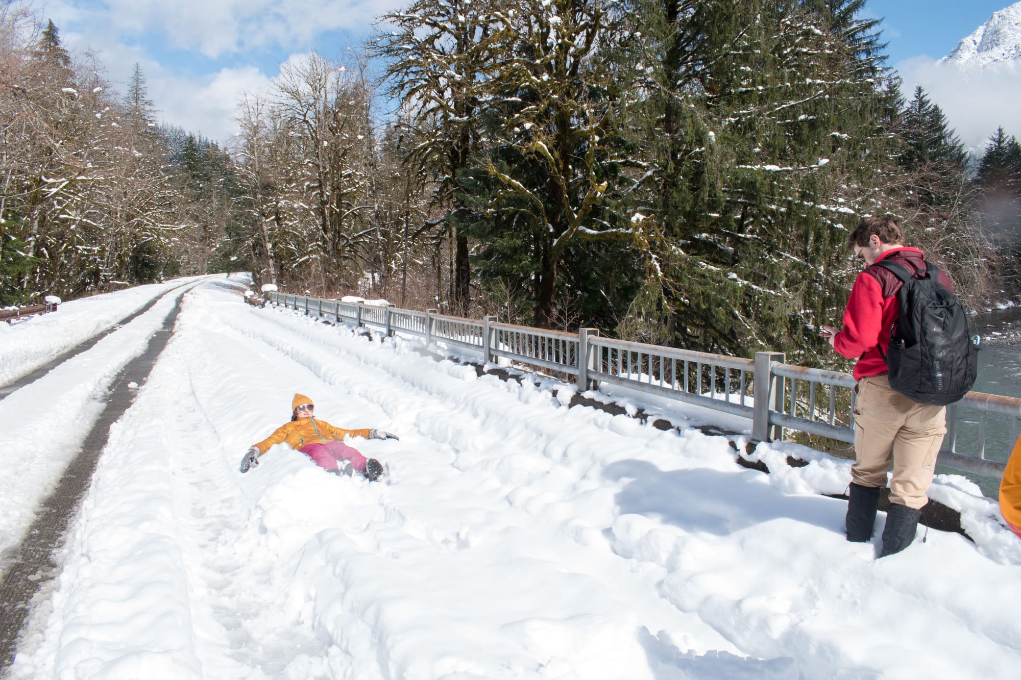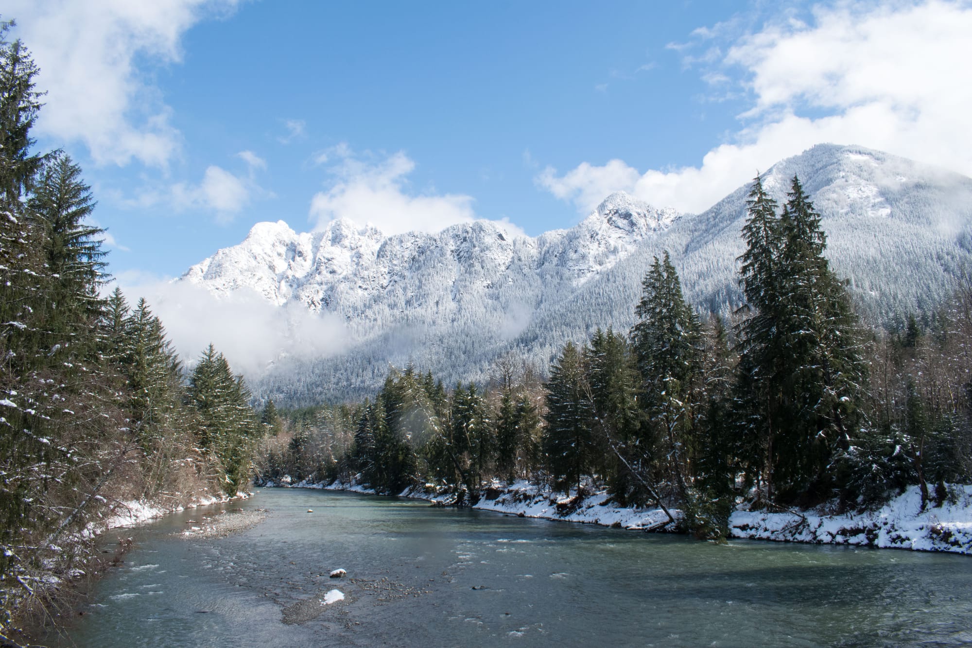 We opted to plow ahead with our weekend hike plan, but it became much more of a snowventure than anyone anticipated. We'd set out for an excursion similar to my previous up the Middle Fork Snoqualmie, but the snow got thick quick, and ditching the vehicle 5 miles from our destination sounded like a far more satisfying choice than digging ourselves out of a snow bank. Thankfully, there was a secret trail along the river not far from where we parked (made even more secret by almost a foot of snow).