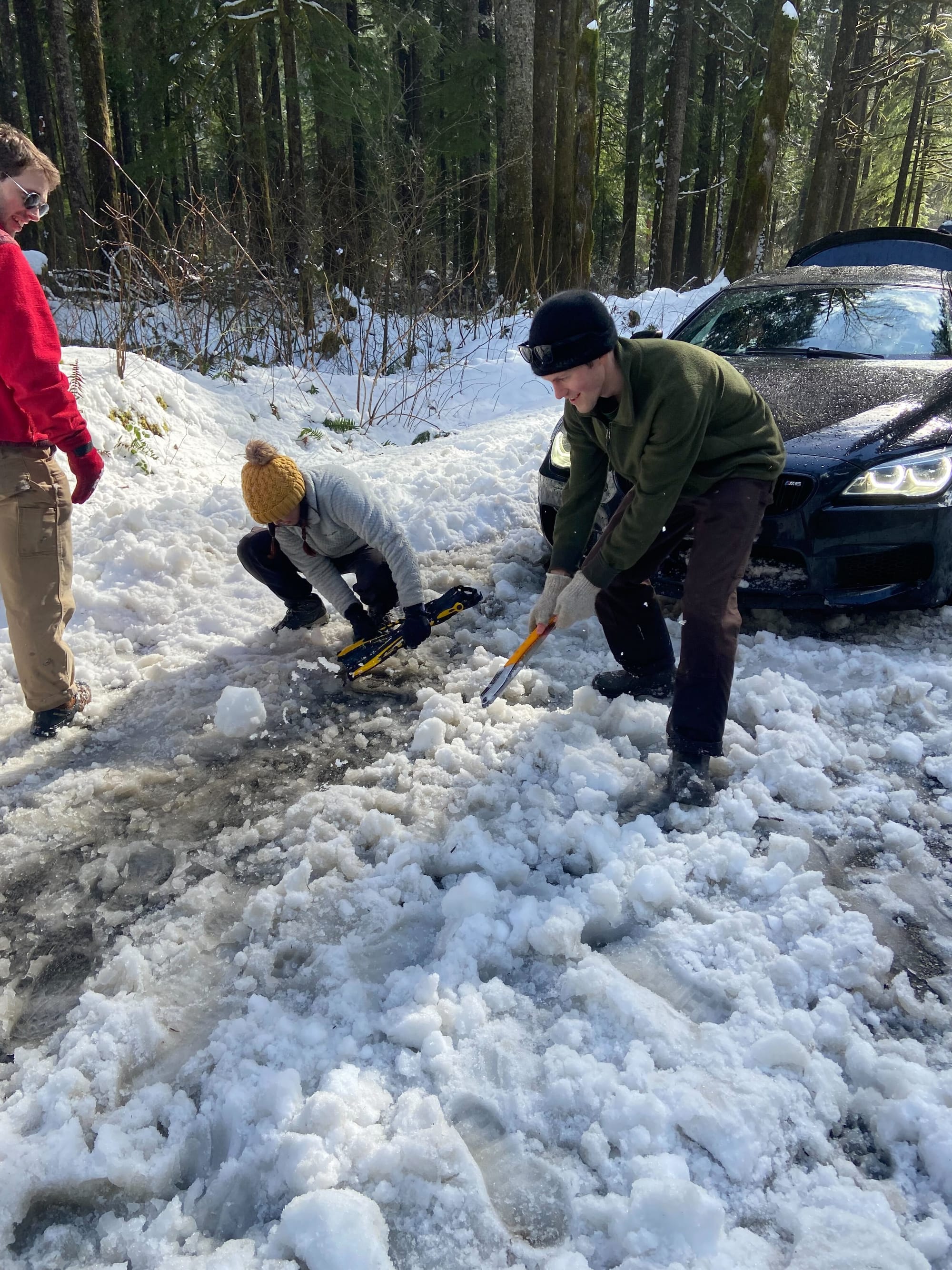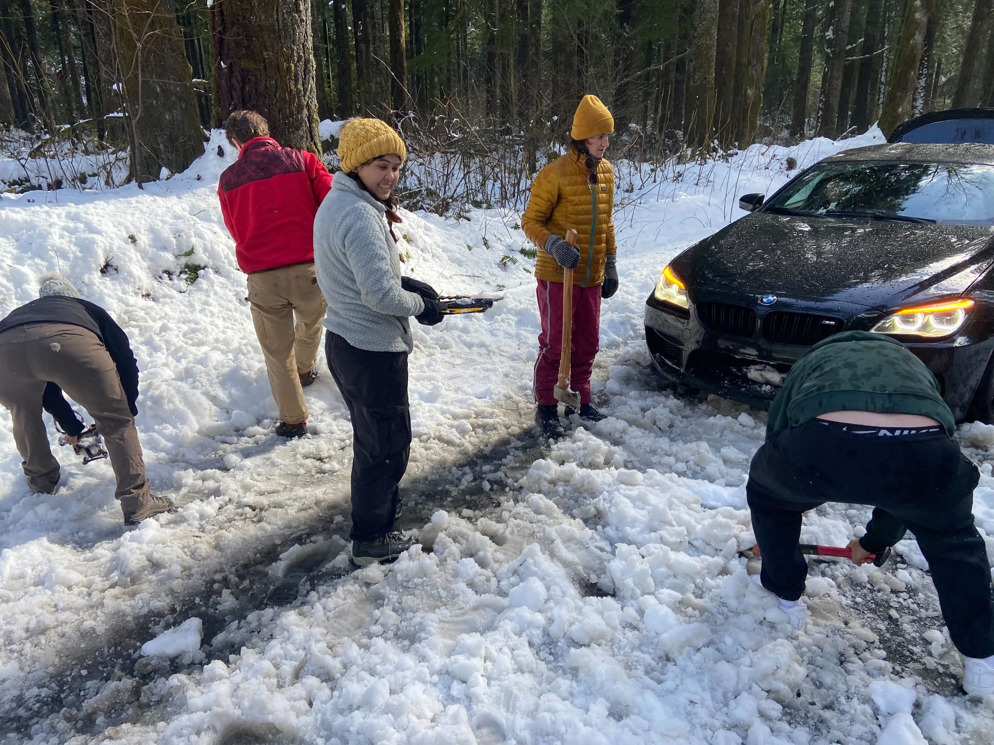 Complete chaos down the road. In the 15-20 min it took to find a shovel, we came up with many far superior implements; axe, handsaw, snowshoes, flippers, bare hands, fragments of BMW bumper, etc.