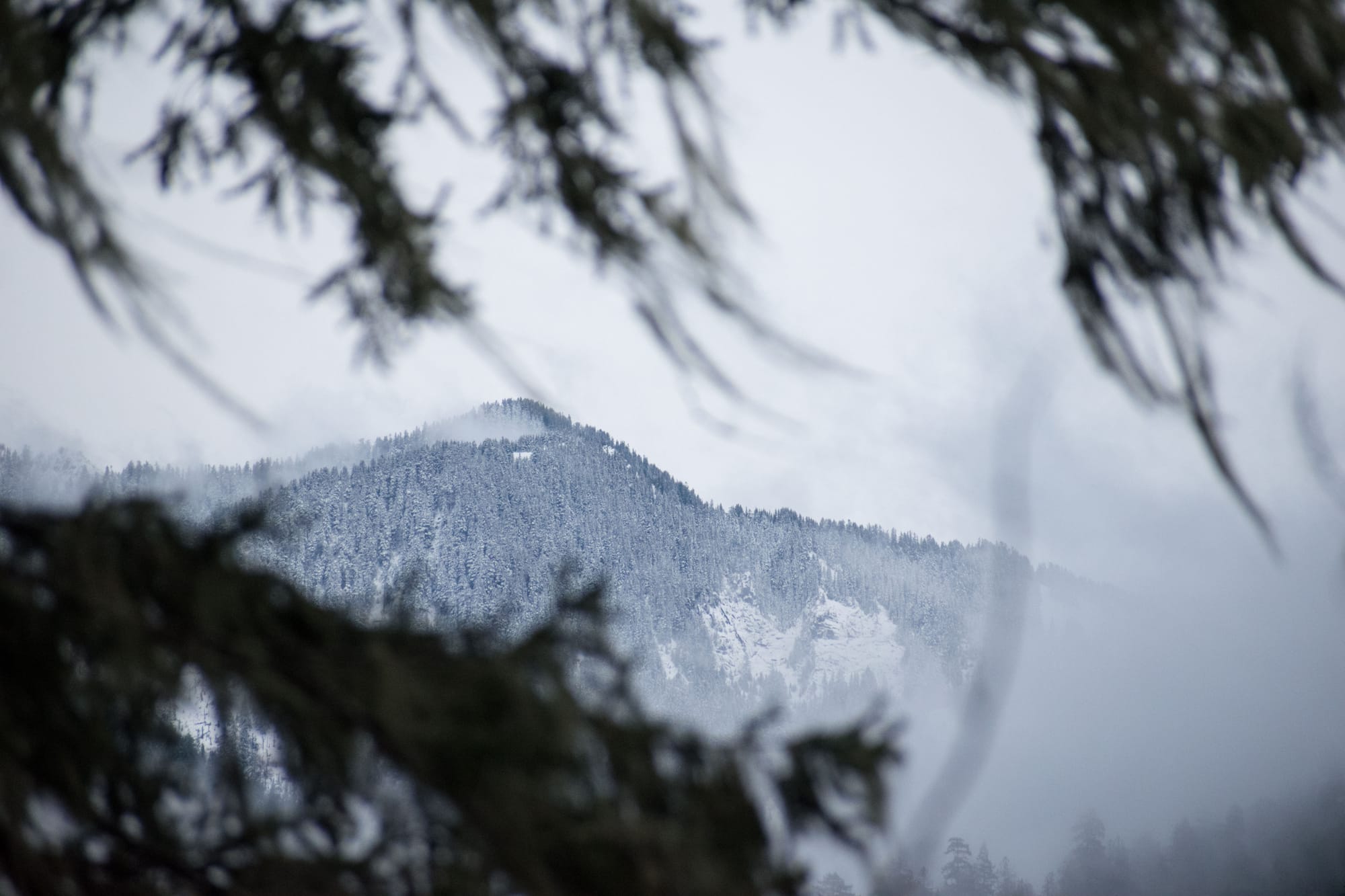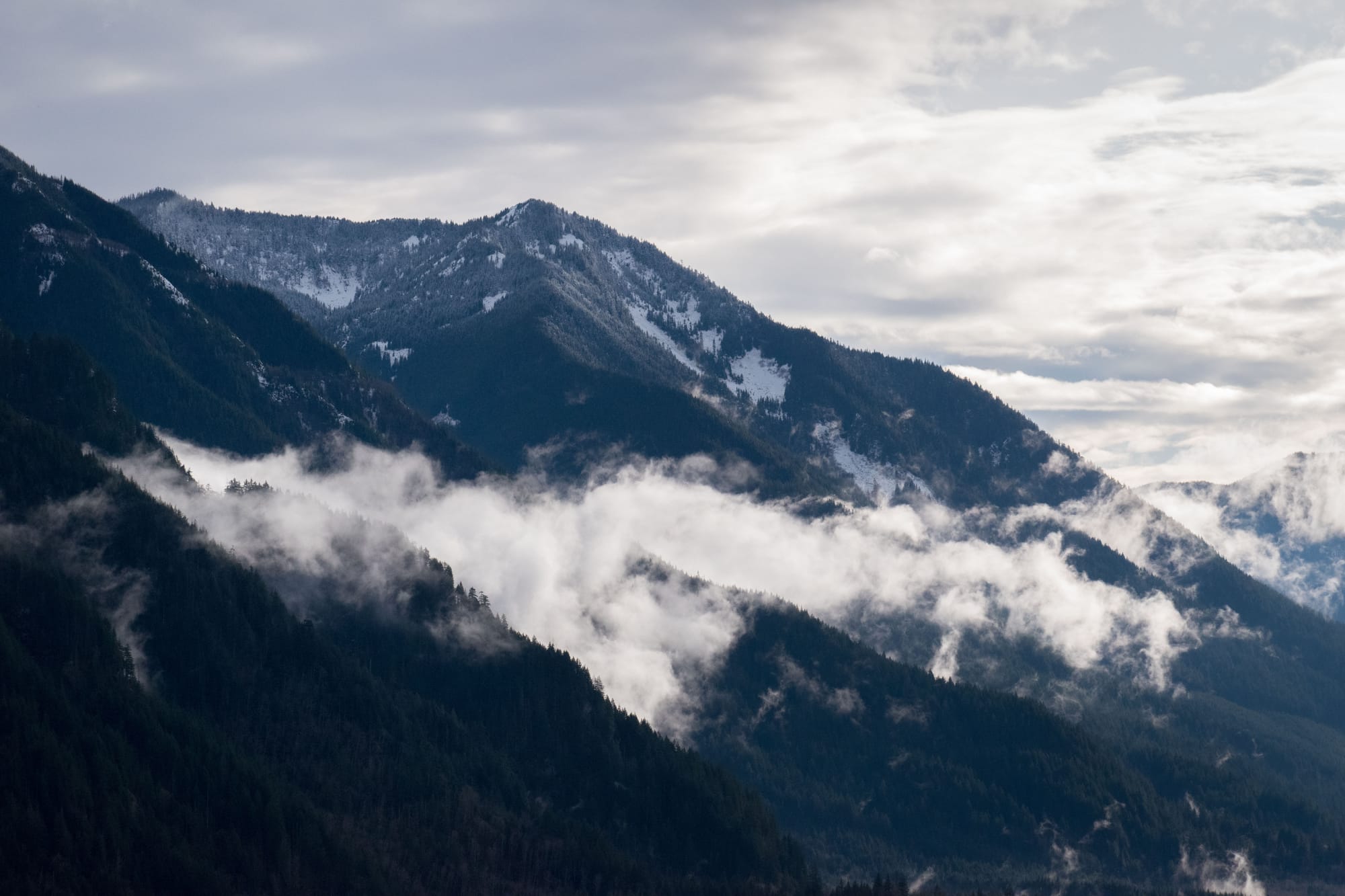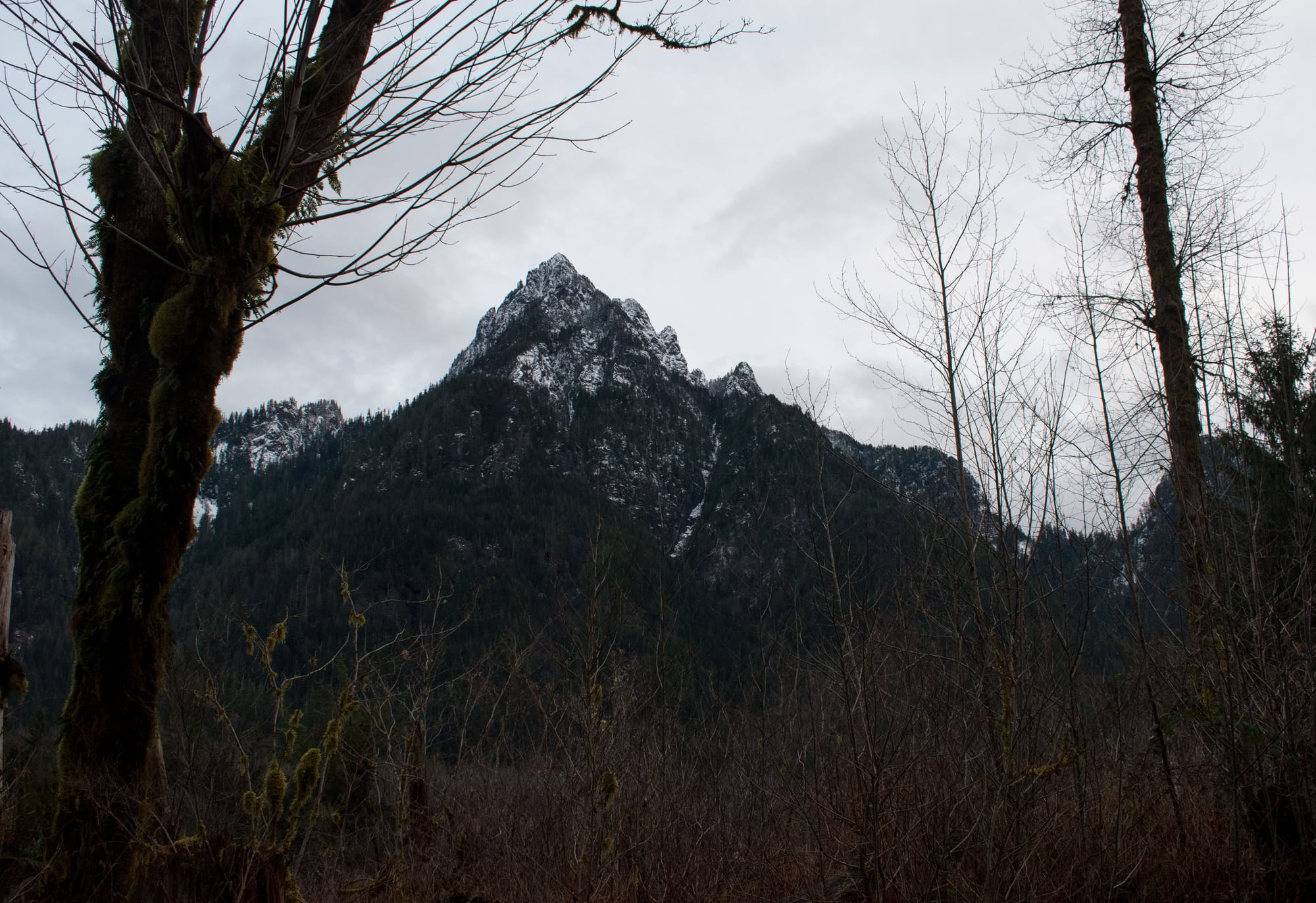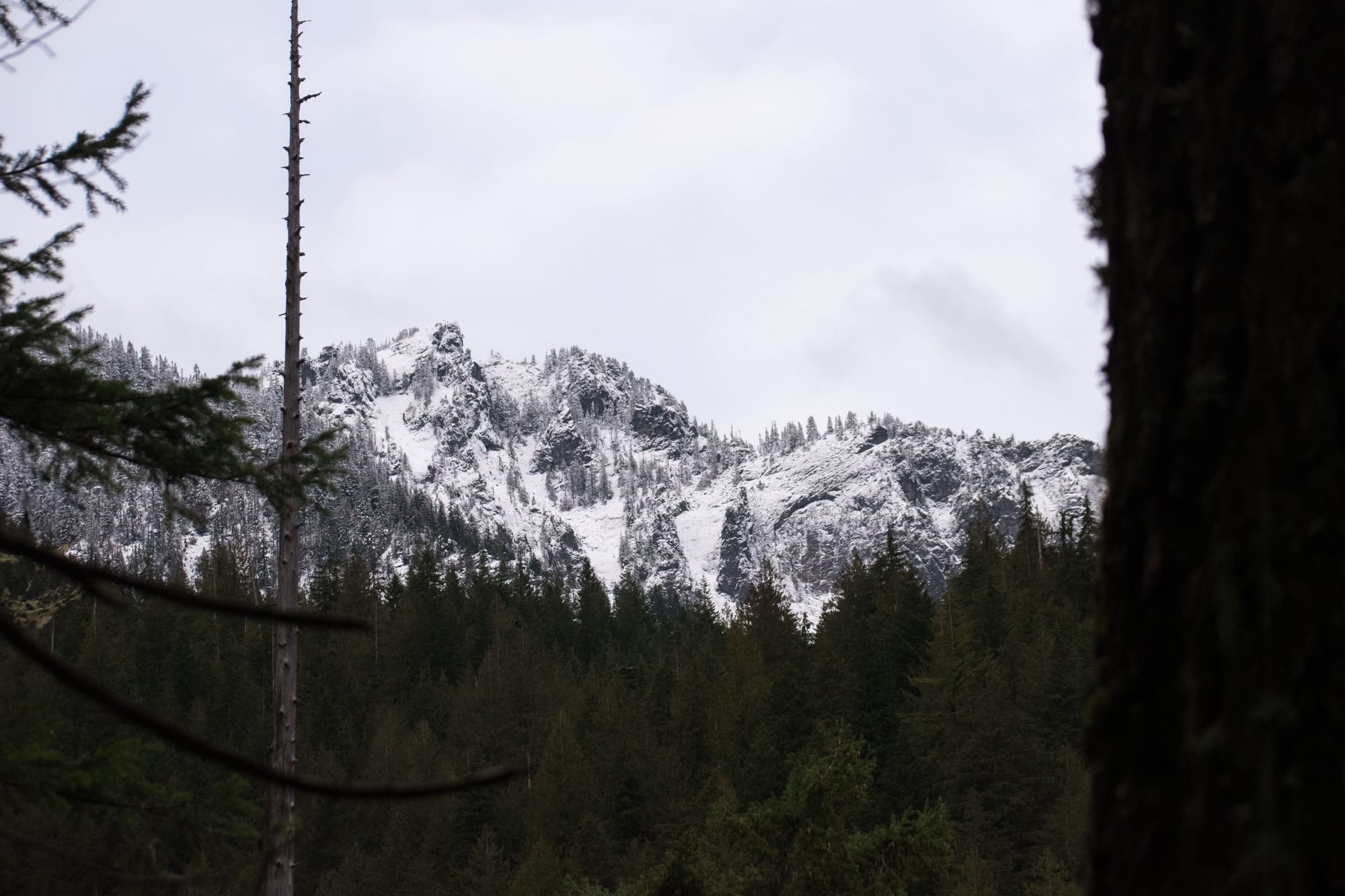 I took a gander out there again in late February, looking to see some snow on the mountain peaks, but not wanting to fight the throngs of people up in the pass seeking the more hands on experience. Although the snow level was a higher elevation than I'd hoped, I got my wish to see it on some far off ridges. But the trip highlight was an unexpected discovery of some hefty old trees that had somehow been spared by the axe, leaving me itching to come back and delve deeper.